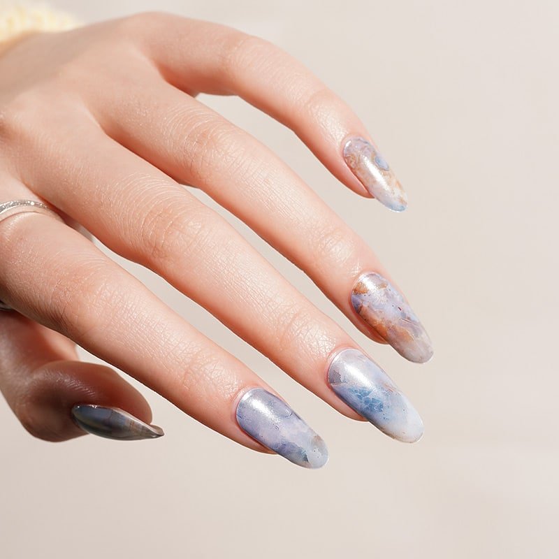 Plongez dans la fraîcheur artistique de nos bandes de vernis gel bleues effet marbré aquarelle. Faciles à poser, elles offrent une manucure lumineuse, originale et élégante. Un design unique pour un look à la fois doux et captivant.
