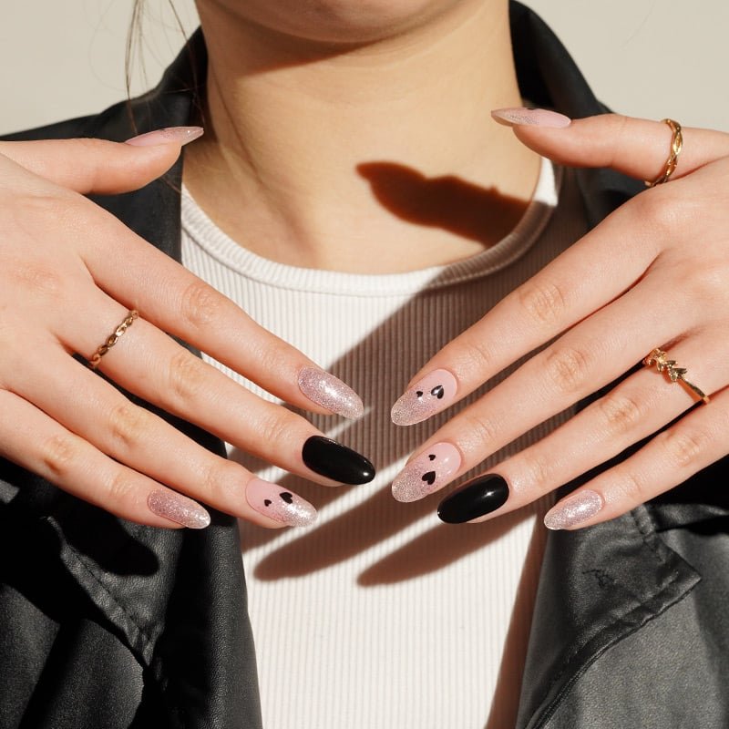 Craquez pour le contraste audacieux de nos bandes de vernis gel dépareillées mêlant noir intense, rose pailleté et motifs cœurs noirs. Faciles à poser, elles offrent une manucure tendance et pleine de personnalité. Un mélange parfait entre douceur romantique et touche rock assumée.