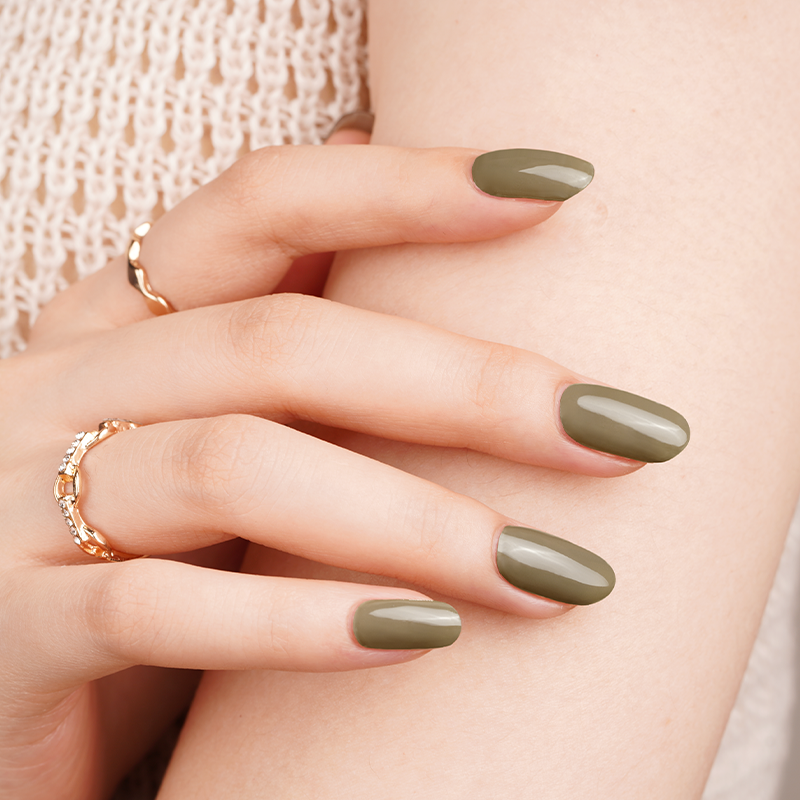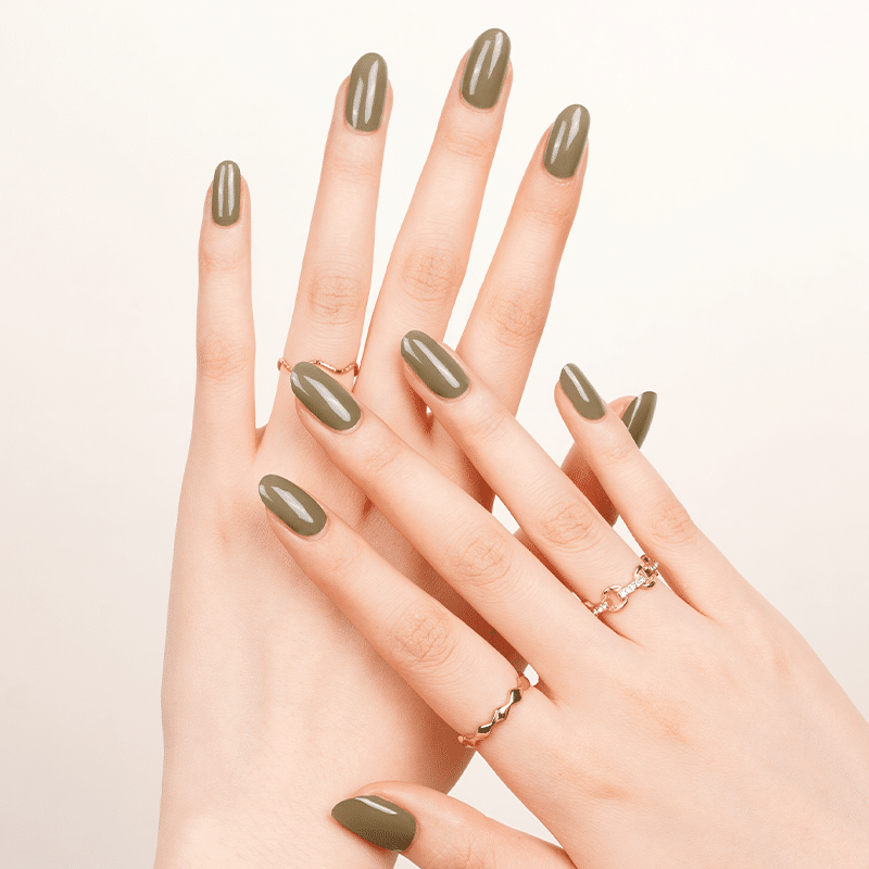 Des bandes de vernis gel UV couleur vert olive pour une manucure tendance, raffinée et originale.