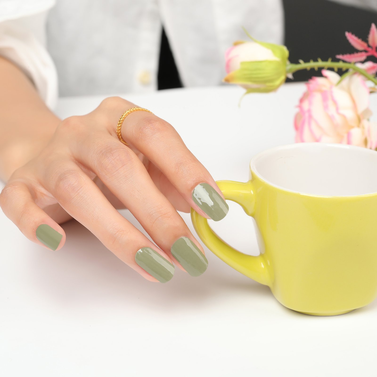 Adoptez le vert olive pour une manucure douce, moderne et pleine de caractère. Pose rapide, brillance durable.